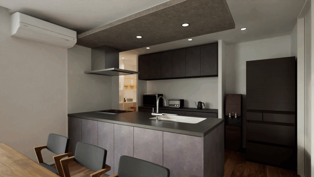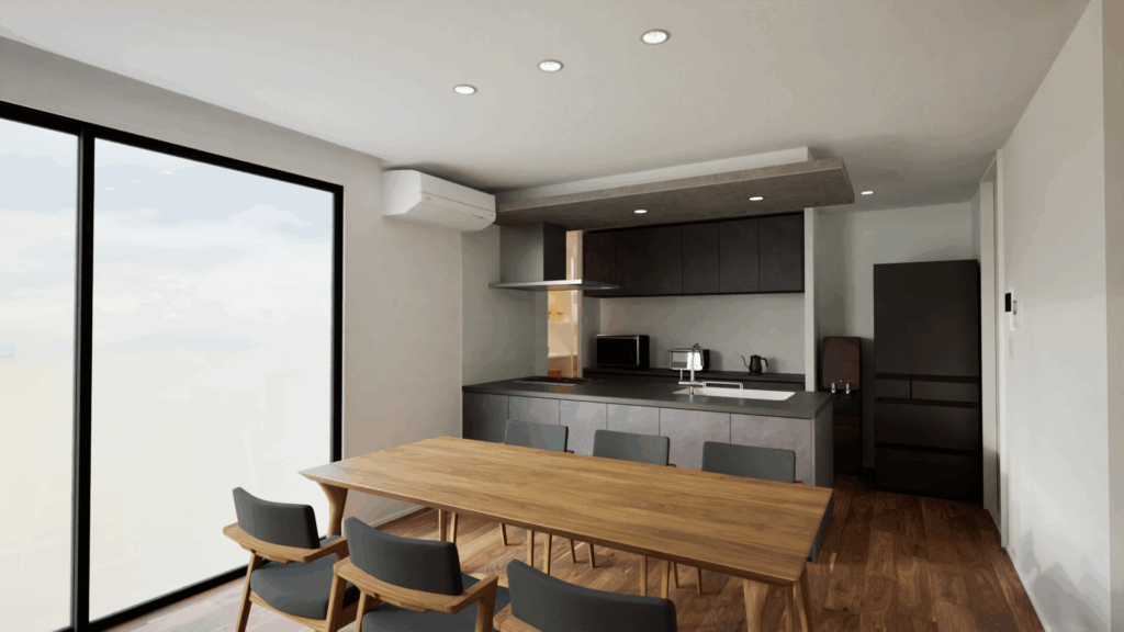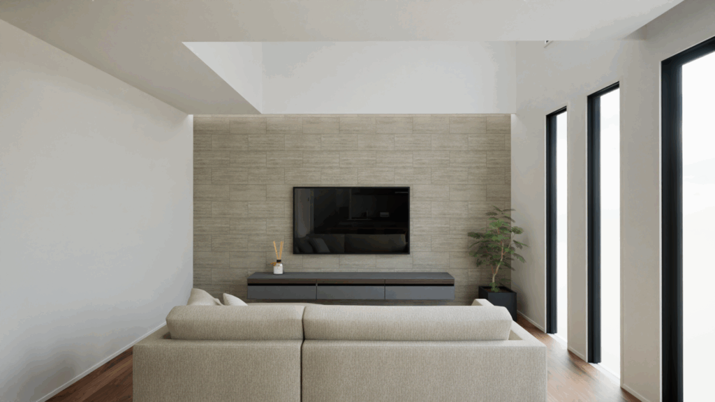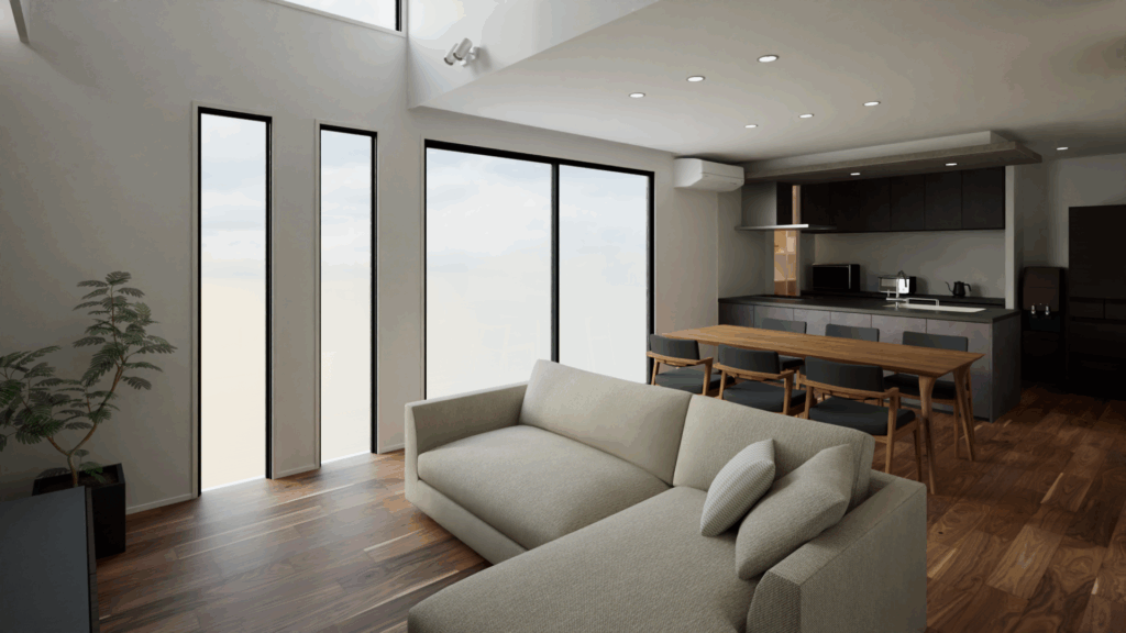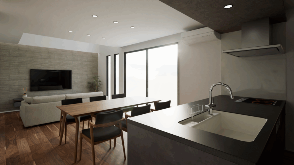 明るさと落ち着きを兼ね備えたシンプルモダンなLDK空間を表現しています。リビングはグレー系のタイル調アクセントウォールがテレビ周りを引き締め、ナチュラルな木目フローリングやベージュのソファと調和。ダイニングには温かみのある無垢材テーブルとブラックチェアを配置し、キッチンは落ち着いたトーンの収納とモダンなアイランドでスタイリッシュにまとめています。大開口窓から光が差し込み、吹き抜けの開放感と合わせて、心地よく過ごせる空間を演出しています。