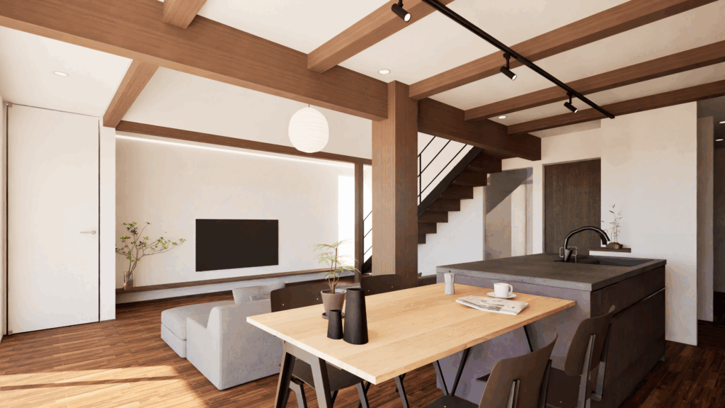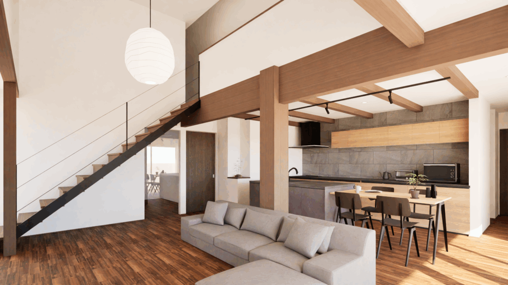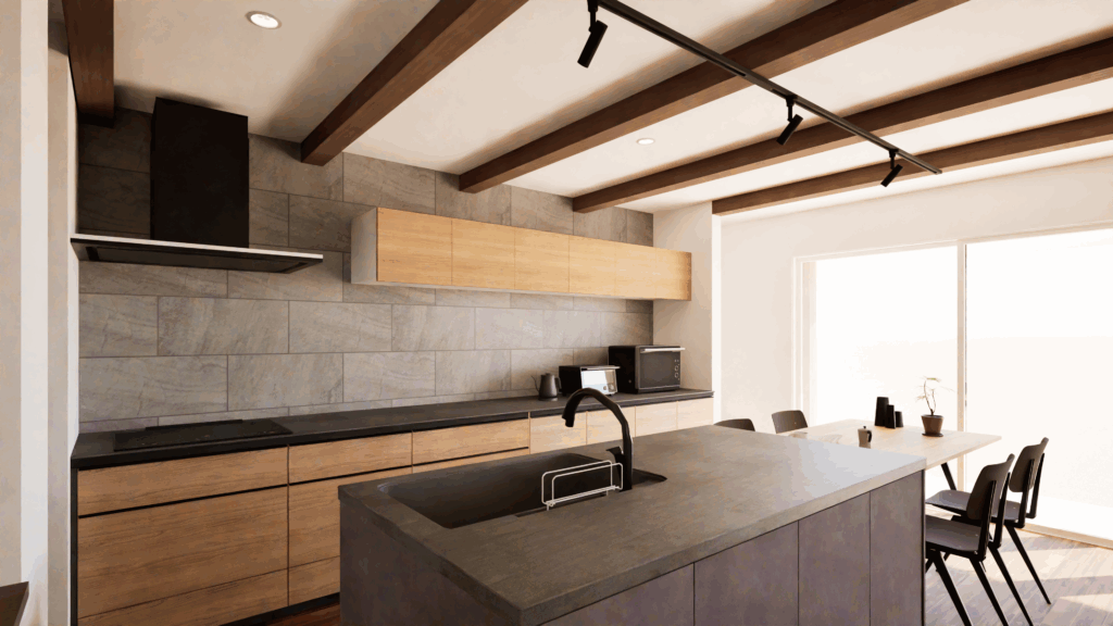 このCGは、木の温もりとモダンなデザインを融合させたLDK空間を描いています。天井に走る化粧梁が印象的で、空間に奥行きとリズムを与え、石調タイルのキッチン壁面と木目の収納がスタイリッシュな雰囲気を演出。アイランドキッチンは機能性とデザイン性を兼ね備え、ダイニングテーブルとの一体感により生活動線もスムーズです。大きな窓から差し込む自然光が室内を柔らかく包み込み、落ち着きと開放感を両立させた居心地のよい住まいを表現しています。