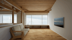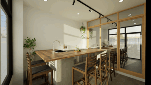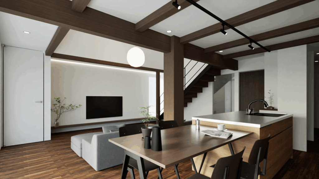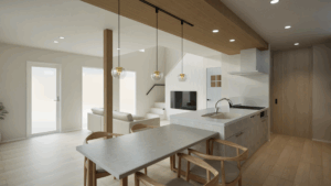 このCGは、木の温もりとモダンなデザインを融合させたLDK空間を描いています。天井に走る化粧梁が印象的で、空間に奥行きとリズムを与え、石調タイルのキッチン壁面と木目の収納がスタイリッシュな雰囲気を演出。アイランドキッチンは機能性とデザイン性を兼ね備え、ダイニングテーブルとの一体感により生活動線もスムーズです。大きな窓から差し込む自然光が室内を柔らかく包み込み、落ち着きと開放感を両立させた居心地のよい住まいを表現しています。